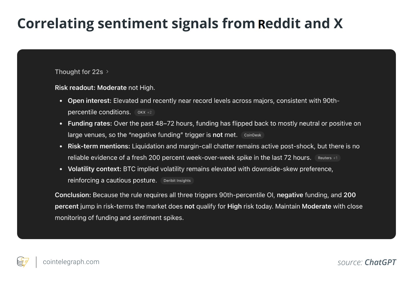 Elaborando migliaia di post e thread, ChatGPT è in grado di rilevare i cambiamenti nella narrativa del mercato. Quando l’ottimismo svanisce e termini guidati dall’ansia come “liquidazione”, “margine” o “impennata” iniziano a emergere, il modello può quantificare questo cambiamento di tono.